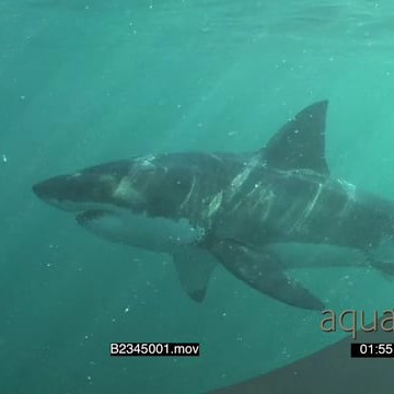 Great white shark gently swimming underwater trying to bite bait line and fails then continues and passes a cage with a diver filming UWHAND