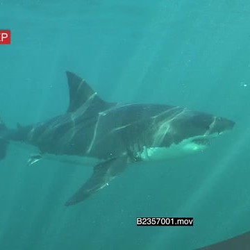 Great white shark gently swimming underwater in ocean passing by camera UW HAND