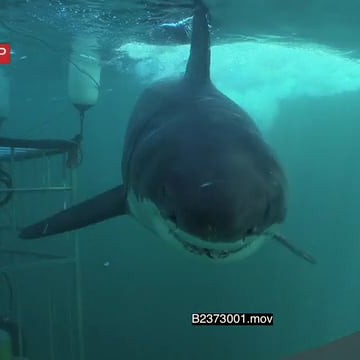 Diver in a cage filming Great White Shark swimming underwater in ocean trying to bite the bait line but fails passing by camera UW HAND