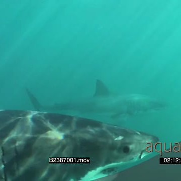 A pair of Great white sharks gently swimming underwater in ocean passing camera UW HAND