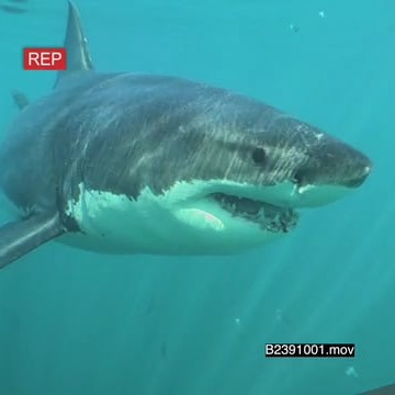 Great white shark gently swimming underwater in ocean passing by camera UW HAND