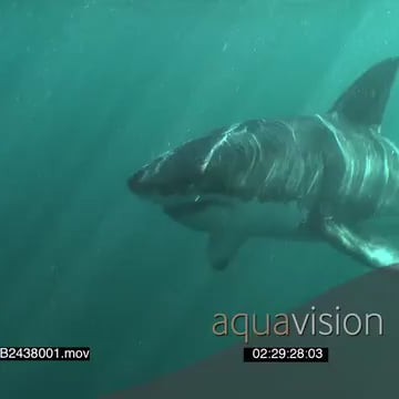 Great white shark swimming underwater in ocean and crashing into boat trying to bite a bait line UW HAND