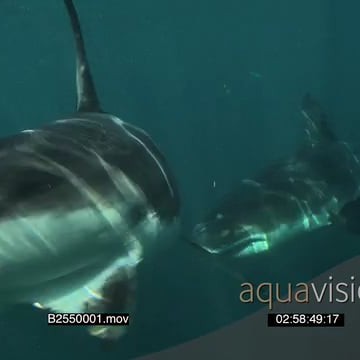 A pair Great white sharks gently swimming underwater in ocean passing camera and each other MLS PAN HAND