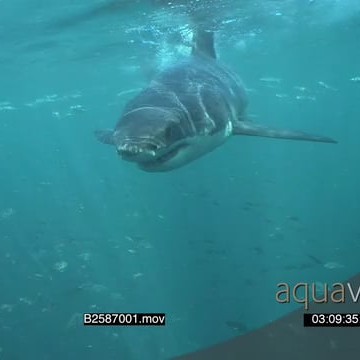 A Great white shark gently swimming underwater in ocean turning and passing through school of Cape Silversides UW HAND