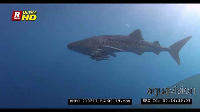 A Close Up shot of a Juvenile Whale Shark swimming past the camera.