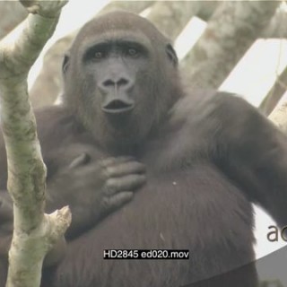 Gorilla sitting in tree beating chest and looking at camera MS HAND
