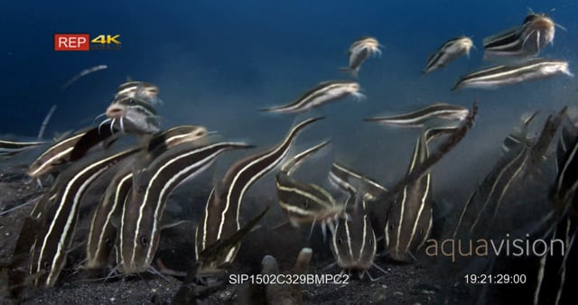 CU of school of striped eel catfish hunting, sucking on the sea sand