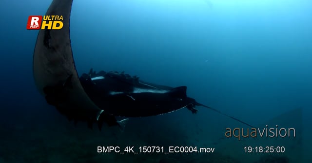 Giant Manta ray that is heavily laden with Remora’s glides through the blue sea.