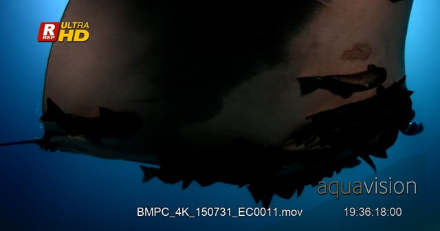 CU shot of a giant manta ray that is heavily laden with Remoras.