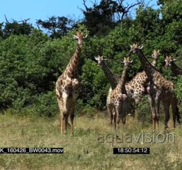 A Herd of Giraffes walking and feeding on tree leaves With a Dazzle on Zebras grazing on the Savanna MWS