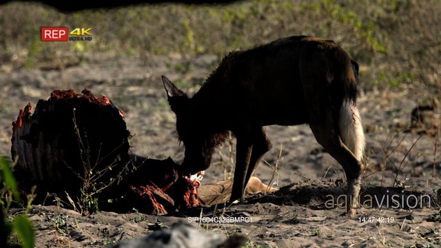African Wild Dog pulling a big chunk of meat from the kudu carcass.