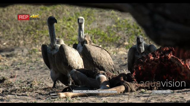 A Flock White-backed Vultures standing next to the kudu kill and flies off after being chased by the wild dogs