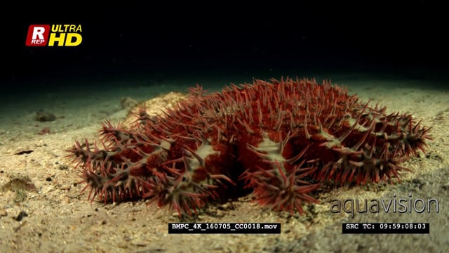 A red and cream coloured crown-of-thorns sea star hunting for food at night