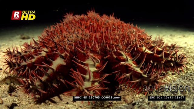 A red and cream coloured crown-of-thorns sea star hunting for food at night