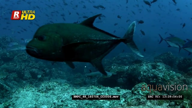 Giant trevally, bluefin trevally and whitetip reef shak swim past the camera