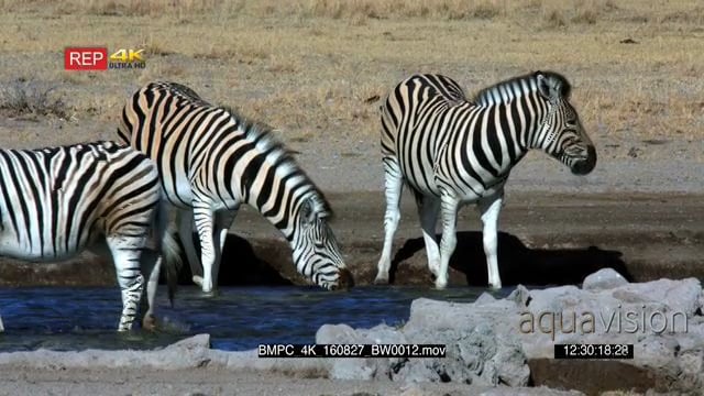 Three zebras drinking in the water point [1] Walking in the water across the camera