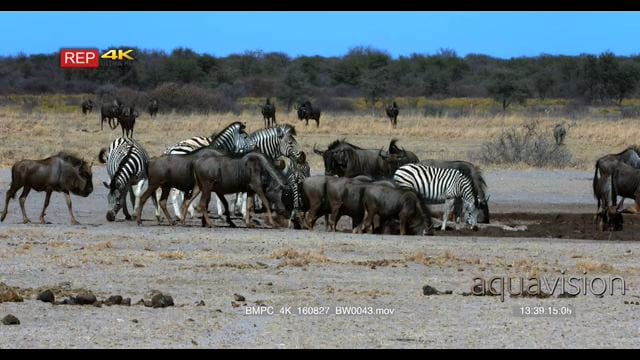 Camera pan across water hole with zebra and blue wildebeest herds drinking water, warthog and springbok in distance