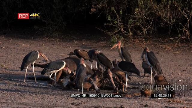 Flocks of vultures and marabou stocks feeding on buffalo carcass MCU