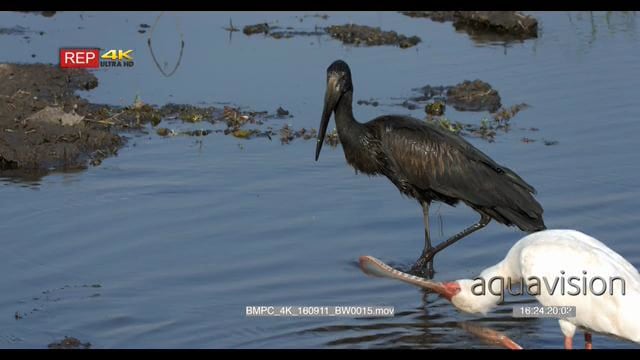 Spoonbill bird grooming and African openbilled stork fishing in the river