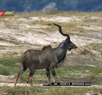 Two male greater kudus with their majestic horns walking on the grassland