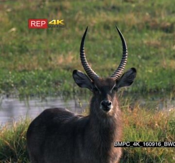 Waterbuck standing looking into camera on the khwaii riverbank with its beautiful uniform sharp horns