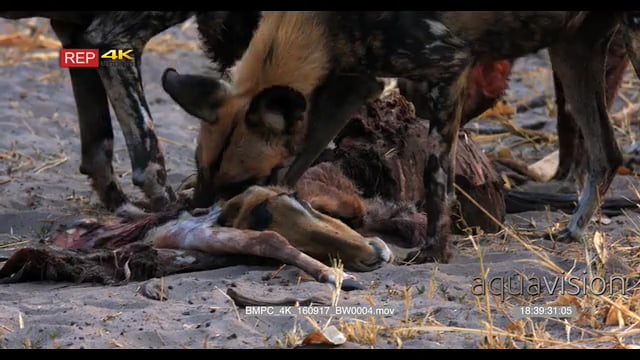African Wild Dogs at a fresh Impala Kill, feeding and tearing at flesh MCU