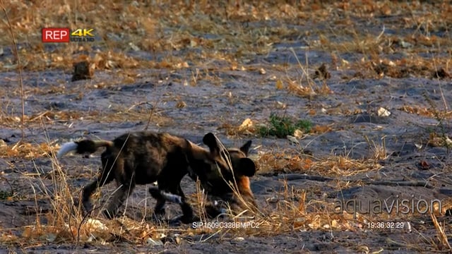 A Pair of African Wild dogs play fighting on the field.