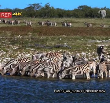 Large Dazzle of zebra drinking water while rest of the herd walking away, male elephant walking towards the river