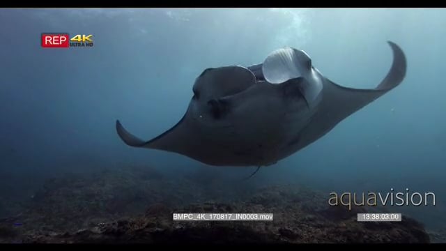 Female manta ray swimming towards camera and float right above the camera touched camera by accident and dashed off
