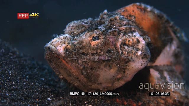 A Rack focus shot from behind to the front of a grumpy orange and white Humpback scorpionfish, scorpaenopsis diabolus
