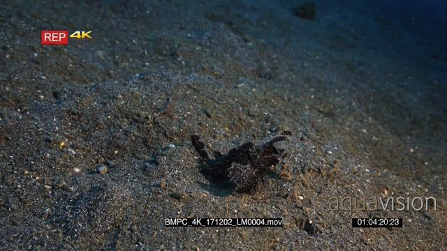 Close up shot of a brown ambon scorpionfish Pteroidichthys hopping along the sea bed