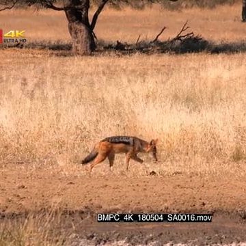 Tracking side view shot of a black-backed jackal leaving the waterhole and trotting into the grassland
