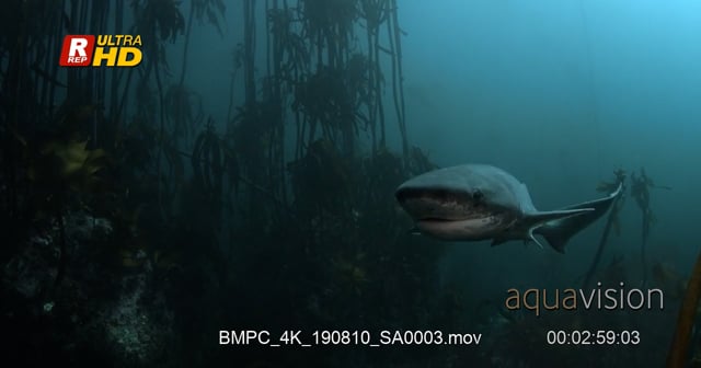 Close tracking shot of a Broadnose sevengill shark, cow shark swimming towards camera turn and swims away between the kelp.