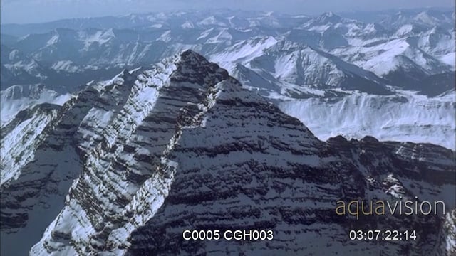 Aerial panning shot of rugged mountains.