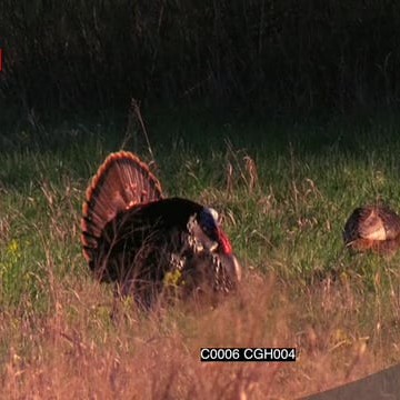 Turkey standing and looking around and the other one walking around and foraging MWS