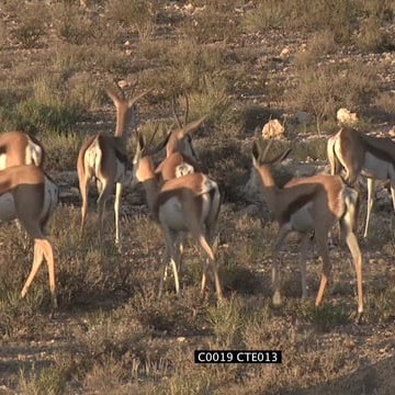 Herd of springbok walking on short grass grazing