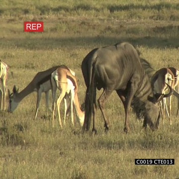 Springbok herd and blue wildebeest grazing walking on short grass LS PAN