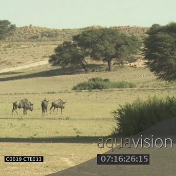 Blue wildebeests walking on short grass