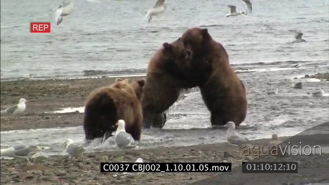 Grizzly Bears chase salmon, two fighting, female catch salmon feeding