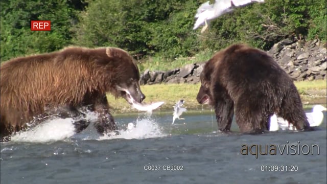 Grizzly Bears fighting in water over salmon GENERAL BEHAVIOUR