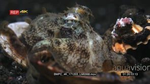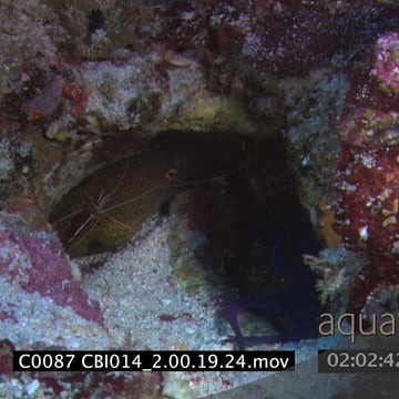Yellow-edged Moray hiding in reef, Galapagos Cleaner Shrimp next it in hole CU; WS