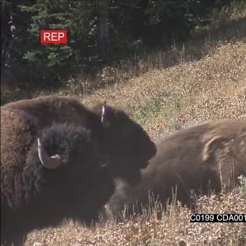 A herd of American Bison standing, walking, grazing and running up the hill GENERAL BEHAVIOUR