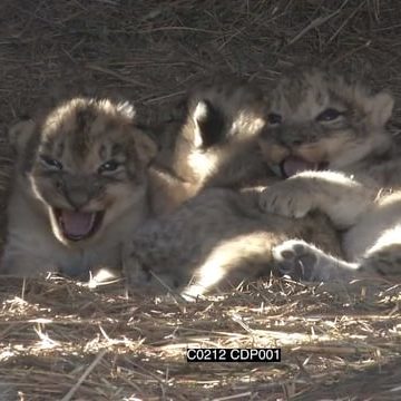 New born Lion cubs Sitting in den Looking towards the camera calling with one walking around