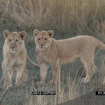Young lion cubs play fight tall dry yellow grass walking off following one another