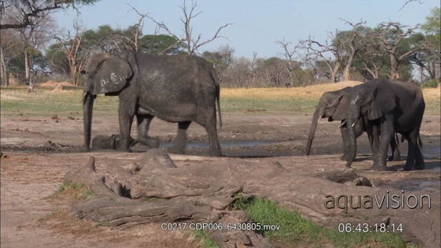 African Elephant calf stuck in thick mud hole Elephant herd passing by