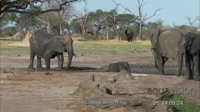 African Elephant Calf Stuck in the mud, mother rescue it out with the Elephant bulls milling around. MS