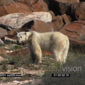 Polar Bear cautiously walking away from camera over boulders towards ocean. No Snow
