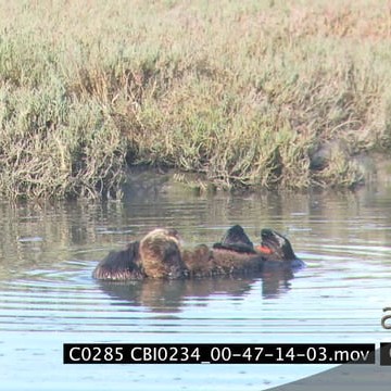 Sea Otter mother with young cleaning grooming laying on back floating in estuary DAY MS