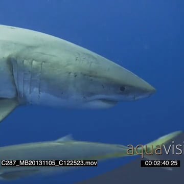 Great White Shark gently approaching and swimming in Deep blue ocean AmCam UW