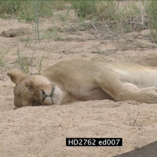 Lion pride resting laying sleeping on riverbank MLS PAN